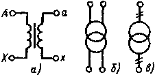 Однофазные трансформаторы на схемах электрических цепей изображаются так, как это указано на рис 8.2, а — в. Начало и конец первичной обмотки обозначаются большими буквами: начало А, конец X, вторичной обмотки — малыми буквами: начало а, конец х. Предполагается, что направление намотки от начала к концу относительно магнитопровода обеих обмоток одинаковое или по часовой, или против часовой стрелки.