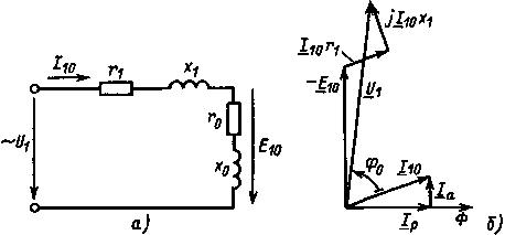 Рис. 8.4. Схема замещения ( а ) и векторная диаграмма ( б ) холостого хода трансформатора