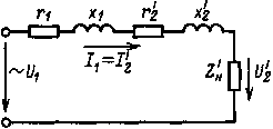 где r к = r 1 + r' 2— активное сопротивление обмоток трансформатора; х к = х 1 + х' 2 — индуктивное сопротивление обмоток трансформатора; r' н — приведенное значение активного сопротивления нагрузки; х' н — приведенное значение индуктивного сопротивления нагрузки.