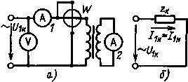 Рис. 8.10. Схема опыта короткого замыкания ( а ), схема замещения трансформатора при коротком замыкании ( б )