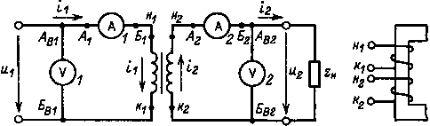 Если действительное направление тока (движение положительных зарядов) такое, как указано на рис. 8.13,— от точки A 1 к точке Б 1 (соответственно от А 2 к Б 2) измерительного устройства, то значения тока записываются выше оси времени (если бы амперметр мог реагировать на мгновенное значение тока, то его стрелка отклонялась бы вправо), при обратном направлении — ниже оси (стрелка амперметра отклонялась влево). Если действительное направление напряжений такое, как указано на рис. 8.13, т. е. точка АB 1 измерительного устройства имеет положительный потенциал, а точка Б B 1 — отрицательный (соответственно А В 2 — положительный, Б В 2 — отрицательный), значения напряжения записываются выше оси времени (если бы вольтметр мог реагировать на мгновенное значение напряжения, то его стрелка отклонялась бы вправо), при обратной полярности — ниже оси времени (стрелка вольтметра отклонялась бы влево). Из графиков рис. 8.12 следует, что ток в первичной обмотке i 1 отстает от напряжения u 1 на угол, значение которого обусловлено параметрами трансформатора z к и потребителя z н = r н + jx н.