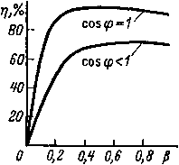 На рис. 8.23 изображены графики зависимости КПД от коэффициента загрузки трансформатора при различных значениях cos φ2.