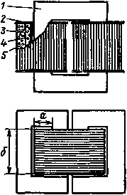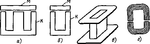 Площадь сечения окна магнитопровода всегда имеет прямоугольную форму с соотношением сторон б/а = 1,5 ÷ 2,5 (см. рис. 8.24). При такой форме магнитопровод имеет наименьшую массу и, следовательно, меньше потери энергии в нем по сравнению с квадратной формой окна. Обмотка выполняется из медного провода круглого или прямоугольного сечения, чаще всего с эмалевой изоляцией. В отдельных случаях применяются и другие изоляционные материалы. Обмотка укладывается плотными рядами на заранее изготовленный каркас (рис. 8.25, в) из электрокартона, текстолита или пластмассы. Между отдельными обмотками прокладывается слой изоляции из бумаги, лакоткани или другого изоляционного материала. После изготовления обмоток производится сборка трансформатора. Если магнитопровод имеет П-образную форму (рис. 8.25, б), то часть пластины К вставляется в обмотку поочередно то сверху, то снизу, а в возникшие промежутки между ними сверху и снизу вставляются части пластины М. При такой сборке последующий слой перекрывает место стыка предыдущего слоя. Сборка магнитопровода трансформатора, имеющего Ш-образную форму магнитопровода (рис. 8.25, а), производится в том же порядке. Естественно, что в этом случае пластина К вставляется в обмотку своей средней частью.