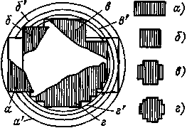 Окружность а' соответствует прямоугольной форме сечения а; окружность б' соответствует квадратной форме сечения б; окружность в' соответствует крестообразной форме сечения в, окружность г' соответствует ступенчатой форме сечения г