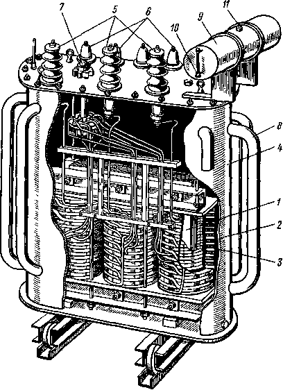 На рис. 8.29 изображен трансформатор мощностью 320 кВ • А. Бак трансформатора герметически закрыт, а изменение объема масла, вызванное колебаниями температуры, компенсируется маслорасширительным бачком 9. В магнитопроводе и обмотках трансформаторов образуются значительные потери энергии, нагревающие трансформатор. И если поверхность бака недостаточная, трансформатор будет перегреваться. Поэтому бак трансформаторов снабжается радиаторами в виде труб 8, существенно увеличивающими поверхность охлаждения. В трансформаторах большой мощности и этого недостаточно. Действительно, допустим, мощность трансформатора 270000 кВ • А и КПД 98%, следовательно, потери мощности в нем составляют 5400 кВт. Такие трансформаторы охлаждаются с помощью водяных маслоохладителей, через которые пропускается горячее масло трансформатора. Выводы концов обмоток трансформатора осуществляются с помощью проходных фарфоровых изоляторов 5, 6 (рис. 8.29).