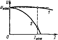 Выполнив обмотку С 1 — C 2 с соответствующим числом витков w c, можно получить при номинальном токе то же напряжение U, что и при холостом ходе (характеристика 1 на рис. 9.20). Как видно, с увеличением тока I напряжение U достигает наибольшего значения, после чего снижается. Последнее объясняется увеличением степени насыщения ферромагнитных материалов магнитной цепи. Последовательная обмотка при соответствующем выборе числа витков дает возможность получить весьма небольшое изменение напряжения генератора.