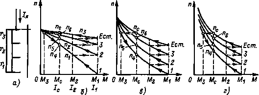 Рис. 9.27. Схема пускового реостата ( а ) и пусковые механические характеристики двигателей ( б, в, г )