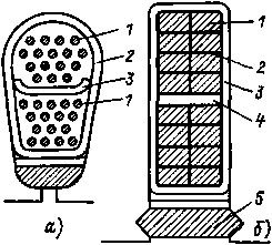 Обозначения на рис. 10.2, а: 1 — провод с эмалевой изоляцией марки ПЭТВ-1; 2, 3 — пазовая и межсекционная изоляции из пленкоэлектрокартона на лавсане толщиной 0,27 мм. Обозначения на рис. 10.2, б: 1 — провод медный; 2 — витковая изоляция из поликарбонатовой пленки; 3, 4— пазовая и межсекционная изоляции из слюдяной ленты на термореактивном лаке; 5 — клин из дерева твердых пород.
