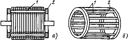 | Рис. 10.3. Короткозамкнутый ротор (а), короткозамкнутая обмотка ротора («беличья клетка») (б) |