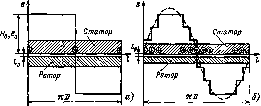 | Рис. 10.7. Графики распределения магнитной индукции в воздушном зазоре асинхронного двигателя: обмотка фазы заполняет два паза (а) и десять пазов (б) |