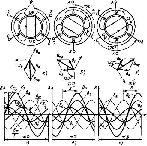 На рис. 10.10, б и в изображены картины магнитных полей и векторные диаграммы для моментов времени, соответствующих точкам 2 и 3 (см. рис. 10.9) На рис. 10.10, г — е приведены графики распределения магнитных индукций вдоль воздушного зазора двигателя (π D — длина внутренней окружности сердечника статора), образованных током каждой фазы, и результирующего поля соответственно для моментов времени, отмеченных точками 5, 6, 7 (см. рис. 10.9). Пунктирными линиями обозначены магнитные индукции, соответствующие положительным направлениям тока при их амплитудных значениях, сплошными линиями — магнитные индукции, соответствующие действительным направлениям тока. Для момента времени, соответствующего точке 5 (см. рис. 10.9), ток фазы А положительный и равен амплитудному значению, токи фаз В и С отрицательные и равны половине амплитудного значения. Поэтому амплитуда магнитной индукции фазы А составит Вт и график поля совпадает с положительным направлением магнитных индукций, амплитуды магнитной индукции фаз В и С составят Вт /2, а их графики будут повернуты на 180° по отношению к положительным направлениям. Результирующее магнитное поле В р можно получить путем сложения магнитных полей всех фаз 1.