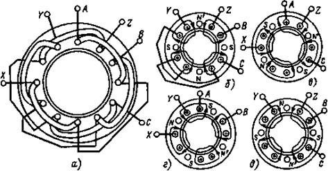 Двигатели выполняются не только с двумя, но и с четырьмя, шестью, восьмью и т. д. полюсами; в общем случае они имеют р пар полюсов. Обмотка каждой фазы статора таких двигателей состоит из нескольких частей, которые соединяются между собой параллельно или последовательно.