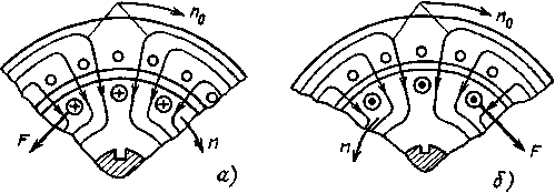 Если ротор вращается, например, по часовой стрелке, то его проводники пересекают неподвижное магнитное поле и в них возникает ЭДС, а следовательно, ток указанного на рис. 10.32 направления. В результате взаимодействия тока ротора с неподвижным магнитным полем возникают сила и момент, действующие на ротор в направлении, противоположном направлению вращения ротора.