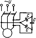 Кроме рассмотренных тормозных режимов существуют и другие, например конденсаторное торможение. Конденсаторное торможение осуществляется по схеме, изображенной на рис. 10.33. После отключения от сети обмотка статора оказывается замкнутой на конденсаторы. Энергия магнитного поля двигателя и электрического поля конденсатора возбуждает в цепи трехфазный ток. Магнитное поле двигателя, образованное этим током, вращается в ту же сторону, что и ротор, но с меньшей частотой, чем ротор. В результате в обмотке ротора возникают ЭДС, ток и тормозной момент. Этот режим аналогичен генераторному тормозному режиму работы двигателя. По мере торможения энергия магнитного и электрического полей уменьшается, превращается в теплоту в обмотках и тормозной момент убывает.