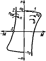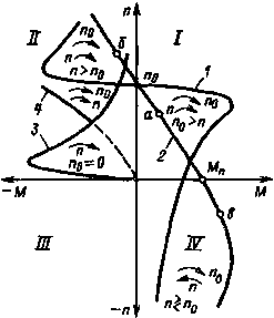 заставит ротор вращаться с частотой, большей n 0. Двигатель будет работать в генераторном режиме с частотой вращения, соответствующей точке б характеристики 2, и развивая тормозной момент