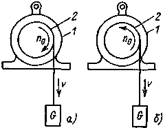 Возникновение тормозных режимов можно пояснить на примере простейшего устройства — лебедки. Барабан 2 лебедки (рис. 10.35), на котором уложен канат с подвешенным на конце грузом G, через систему зубчатых передач связан с валом двигателя 1.