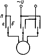 Быстрый останов двигателя и связанного с ним механизма может быть осуществлен по схеме, изображенной на рис. 10.36. Переключатель П позволяет включать двигатель для вращения по часовой стрелке и против часовой стрелки. Если в положении а переключателя ротор вращается по часовой стрелке, то при положении б он вращается против часовой стрелки.