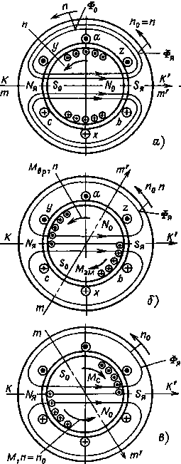 Положение оси mm' магнитного поля ротора относительно оси КК' поля якоря и значение момента М эм зависят от нагрузки двигателя. Так, при работе двигателя в режиме идеального холостого хода ротор занимает положение, показанное на рис. 11.3, а, при котором электромагнитный момент М эм равен нулю. Некоторой механической нагрузке двигателя соответствует положение ротора, изображенное на рис. 11,3, в, которому соответствует определенный вращающий момент М эм.