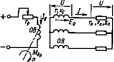 В цепь обмотки возбуждения ОВ генератора, питаемой постоянным током, включен реостат r p, служащий для регулирования тока возбуждения I в, а в конечном итоге — напряжения U на выводах обмотки якоря генератора.