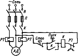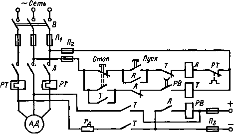 Защита силовых цепей и двигателя от коротких замыканий осуществляется плавкими предохранителями П, защита двигателя от перегрева, вызванного перегрузками или другими причинами, — тепловым реле РТ. Включение и отключение двигателя производятся электромагнитным аппаратом — контактором К. Для пуска и останова использованы две кнопки Пуск и Стоп Выключатель В служит для снятия напряжения с установки после окончания рабочего дня или при ремонте.