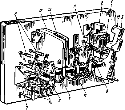 На рис. 12.7 изображен трехполюсный контактор переменного тока. Электромагнитная система контактора состоит из катушки 1, неподвижного сердечника 2 и якоря 3, укрепленного на валике 4. После включения катушки в сеть магнитный поток, созданный переменным током катушки, притягивает якорь и поворачивает валик 4, на котором укреплены силовые подвижные контакты 5. В результате происходит замыкание силовых подвижных 5 и неподвижных 6 контактов. Кроме силовых контактов контактор имеет вспомогательные замыкающие 8 и размыкающие 7 контакты. Эти контакты замыкаются и размыкаются пластинами 14, укрепленными на траверсах 9, которые в свою очередь укреплены на валике 4. При повороте валика контакты 8 замыкаются, а контакты 7 размыкаются. Для уменьшения потерь в сердечнике на вихревые токи сердечник и якорь собраны из отдельных листов электротехнической стали.