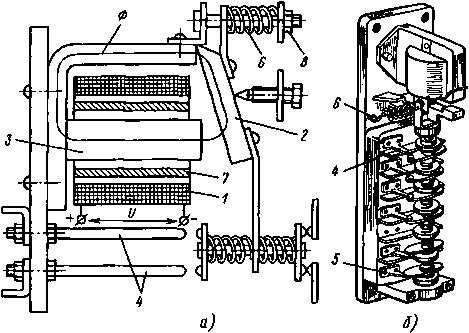 Рис. 12.10. Электромагнитное реле времени ( а ), промежуточное реле переменного тока ( б )