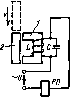 Катушка L неподвижного сердечника 1 соединена параллельно с конденсатором С и через катушку промежуточного реле РП включена в сеть переменного тока. Параметры L и С подобраны так, что цепь находится в состоянии резонанса токов, когда магнитная цепь сердечника 1 замкнута (якорь 2, связанный с механизмом, занимает положение, указанное на рис. 12.11); вследствие этого ток в катушке реле относительно мал и якорь реле не притянут. Когда же подвижный якорь 2, связанный с элементом механизма, займет положение, указанное пунктиром, магнитная цепь сердечника 1 окажется разомкнутой и индуктивность катушки L резко уменьшится. Резонанс в цепи нарушится, ток в катушке реле РП резко возрастет, его якорь притянется.