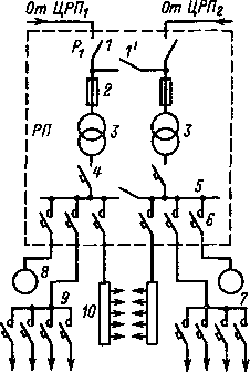 Питание цеховых сетей низкого напряжения осуществляется от РП. В цеховом РП (рис. 12.17) установлены один или несколько понижающих трансформаторов 3, работающих параллельно. В цепи обмотки высокого напряжения трансформаторов устанавливают разъединитель 1 и плавкий предохранитель 2 (для трансформаторов мощностью до 320 кВ • А).
