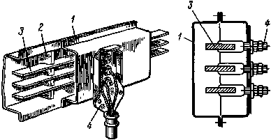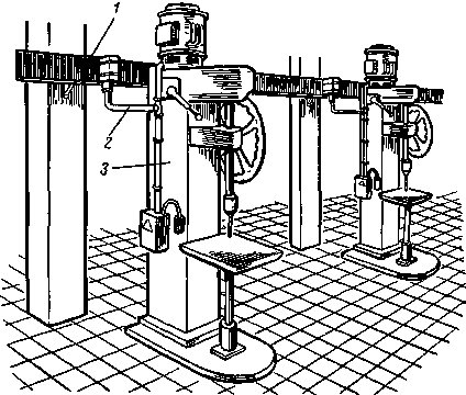 В настоящее время для питания станочного и другого оборудования машиностроительных заводов находят широкое применение шинные сборки. Шинные сборки (рис. 12.18) состоят из стального кожуха 1, внутри которого в изоляционных стойках 2 укреплены стальные или алюминиевые шины 3. К шинам на расстоянии 0,8—1 м приварены штыри 4, к которым присоединяют провода потребителей. Шинные сборки укрепляют на стенах и колоннах цеха на высоте 2,5 м. На рис. 12.19 изображены шинные сборки 1 и подводка 2 от них к металлорежущим станкам 3.