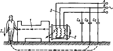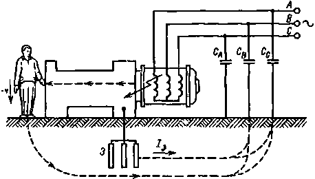 На рис 12.20 изображены производственный механизм 1, фланцевый двигатель 2, прикрепленный непосредственно к механизму, заводская сеть 3 и емкости С А, С В, С С между каждым из проводов заводской сети и землей. Провод сети и земля, между которыми находится изоляция, обладают определенной емкостью. При значительной протяженности заводской сети емкость оказывается значительной, а ее емкостное сопротивление — соизмеримым с сопротивлением тела человека. Электрическое оборудование, в том числе и двигатель, часто устанавливают, как изображено на рис. 12.20, непосредственно на производственном механизме. В нормальных условиях все токоведущие части аппаратов и двигателей надежно изолированы от металлических корпусов и соприкосновение человека с производственным механизмом не представляет никакой опасности. Однако в случае пробоя изоляции электрический провод через поврежденную изоляцию соединится непосредственно с корпусом машины и человек, коснувшийся производственного механизма, окажется соединенным с одним из проводов заводской электрической сети (на рис. 12.20 с проводом А). Казалось бы, при этом человек не попадет под напряжение, так как он касается лишь одного провода. Действительно, человек не окажется под напряжением, если он стоит на сухом полу с хорошими изоляционными свойствами. Однако в большинстве случаев пол влажный и хорошо соединен с землей. Поэтому ноги человека через пол, землю и далее через емкости С В и С С будут соединены с другими проводами (рис. 12.20). В результате человек окажется включенным параллельно емкости С А и между его рукой и ногами будет напряжение, которое вызовет в человеке опасный ток.