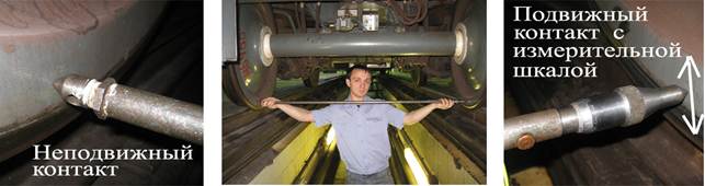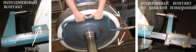 Для проведения измерений необходимо: установить неподвижный контакт на середину внутренней грани обода колеса, подвести подвижный контакт к внутренней грани 2 колеса данной колёсной пары и легкими движениями сверху вниз и вращением измерительной головки на подвижном контакте добиться соприкосновения наконечника подвижного контакта с внутренней гранью обода 2-го колеса. Далее по измерительной шкале определить расстояние между внутренними гранямиободьев цельнокатаных колёс.