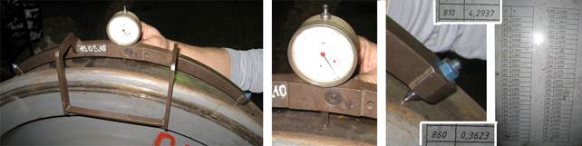 Для проведения измерений необходимо: установить приспособление на повреждённое место на поверхности катания колеса, так чтобы измерительный наконечник своим острием попал в центр ползуна, закрепить корпус стрелочного индикатора на кронштейне, вывести стрелки индикатора на “0”, далее плавно и ровно двигаясь по гребню и плотно прижимая опорную ножку шаблона к внутренней грани обода колеса перевести приспособление на неповреждённое место, показание шкалы индикатора укажет глубину ползуна (необходимо помнить, что малая стрелка индикатора указывает целое количество миллиметров, а большая стрелка доли миллиметров (целый круг большой стрелки составляет 1 мм)). (не допускается ползун глубиной -- более 0,3 мм;