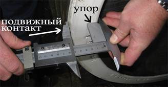 Для проведения измерений необходимо: подвести неподвижный контакт штангенциркуля к внутренней грани обода колеса, при этом упор на штангенциркуле должен плотно касаться наружной грани обода (как это показано на фото выше), после чего подвести рамку подвижного контакта к ободу со стороны поверхности катания колеса, далее по измерительной шкале определить толщину бандажа данного колеса.
