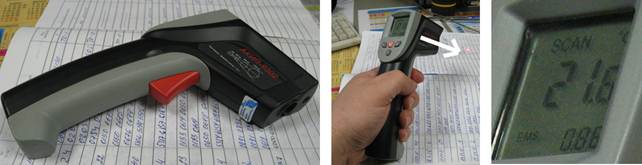 Измерители температуры бесконтактного типа используются для: проверки тепловых узлов во всех случаях когда измерения органолептическим путём затруднено или нагрев теплового узла вызывает подозрение, при этом измерители температуры преобразуют энергию инфракрасного излучения, излучаемую поверхностью объекта в электрический сигнал, который выводится в цифровом обозначении на экран прибора (как показано на фото выше). При этом значение излучательной способности выставляется --- 0,86 (что соответствует --- резина мягкая сырая (согласно п.6.3 Инструкции).
