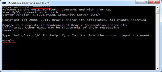 Для перевірки, що сервер працює, можна запустити Пуск – Все программы – MySQL – MySQL Server 5.5 – MySQL 5.5 Command Line Client, у вікні ввести пароль користувача root – повинно появитися запрошення mysql>.
