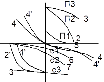 Подъем: 1П – суммирование реостатной характеристики (2) и характеристики ТГ минимальная скорость; 2П – отключается ТГ; реостатная характеристика АД; 3П – естественная характеристика.