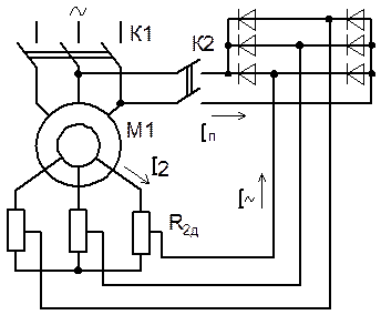 В данном режиме контактор К1 будет отключен, а контактор К2 – включен. Обмотки статора получат питание от роторной цепи через выпрямитель. R2д в цепи ротора – делители напряжения позволяют регулировать связь между током ротора I2 и током статора для получения требуемых условий самовозбуждения. Механические характеристики АД с ФР в режиме динамического торможения с самовозбуждением можно рассчитать двумя способами: