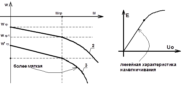 а) В области момента М > Мгр МХ при самовозбуждении имеет высокую жесткость и обеспечивает получение низких устойчивых скоростей спуска.