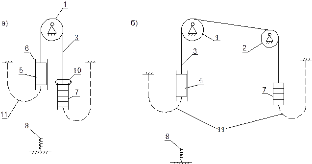 3 – подъёмный канат; 9 – направляющие шкивы;