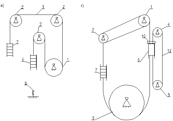 (г) – большая высота, для увеличения силы трения между шкивом и канатами схема с двойным обхватом (1904 г.).