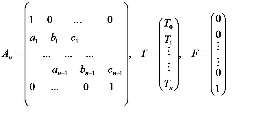 Ее можно переписать в матричном виде AT=F, где А матрица коэффициентов, Т искомая сеточная функция, F заданный вектор краевой задачи.