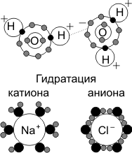 Молекула воды имеет угловую форму: атомы водорода по отношению к кислороду образуют угол, равный 104,5°. Та часть молекулы, где находится водород, заряжена положительно, часть, где находится кислород, — отрицательно, в связи с этим молекула воды является диполем. Между диполями воды образуются водородные связи. Физические свойства воды: прозрачна, максимальная плотность — при 4 °С, высокая теплоемкость, практически не сжимается; чистая вода плохо проводит тепло и электричество, замерзает при 0 °С, кипит при 100 °С и т.д. Химические свойства воды: хороший растворитель, образует гидраты, вступает в реакции гидролитического разложения, взаимодействует со многими оксидами и т.д. По отношению к способности растворяться в воде различают: гидрофильные вещества — хорошо растворимые, гидрофобные вещества — практически нерастворимые в воде.