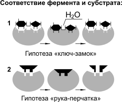 Э. Фишер (гипотеза «ключ-замок») предположил, что пространственные конфигурации активного центра фермента и субстрата должны точно соответствовать друг другу. Субстрат сравнивается с «ключом», фермент — с «замком».