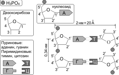 Мономер ДНК — нуклеотид (дезоксирибонуклеотид) — состоит из остатков трех веществ: 1) азотистого основания, 2) пятиуглеродного моносахарида (пентозы) и 3) фосфорной кислоты. Азотистые основания нуклеиновых кислот относятся к классам пиримидинов и пуринов. Пиримидиновые основания ДНК (имеют в составе своей молекулы одно кольцо) — тимин, цитозин. Пуриновые основания (имеют два кольца) — аденин и гуанин.