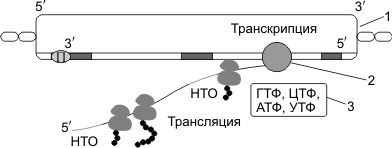 1 — ДНК; 2 — РНК-полимераза; 3 — Нуклеозидтрифосфаты ГТФ, ЦТФ, АТФ, УТФ.