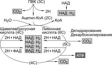 Пировиноградная кислота транспортируется в митохондрии (строение и функции митохондрий — лекция №7). Здесь происходит дегидрирование (отщепление водорода) и декарбоксилирование (отщепление углекислого газа) ПВК с образованием двухуглеродной ацетильной группы, которая вступает в цикл реакций, получивших название реакций цикла Кребса. Идет дальнейшее окисление, связанное с дегидрированием и декарбоксилированием. В результате на каждую разрушенную молекулу ПВК из митохондрии удаляется три молекулы СО2; образуется пять пар атомов водорода, связанных с переносчиками (4НАД·Н2, ФАД·Н2), а также одна молекула АТФ.