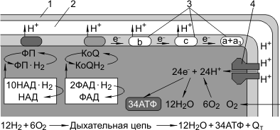 1 — наружная мембрана; 2 — межмембранное пространство, протонный резервуар; 3 — цитохромы; 4 — АТФ-синтетаза.