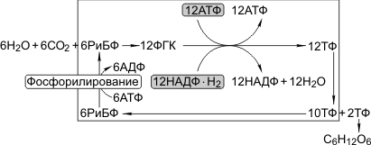 6СО2 + 24Н+ + АТФ → С6Н12О6 + 6Н2О.