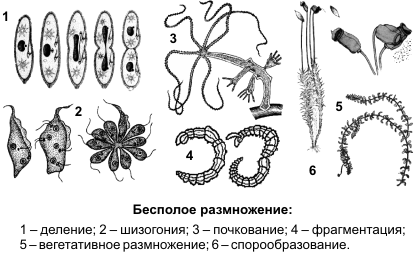 Бесполое размножение осуществляется при участии лишь одной родительской особи и происходит без образования гамет. Дочернее поколение у одних видов возникает из одной или группы клеток материнского организма, у других видов — в специализированных органах. Различают следующие способы бесполого размножения: деление, почкование, фрагментация, полиэмбриония, спорообразование, вегетативное размножение.