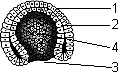 1 — эктодерма; 2 — энтодерма; 3 — бластопор; 4 — гастроцель.
